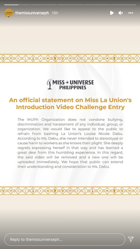 Miss La Union Louise Nicole Dabu has apologized for a statement in her introduction video that has drawn flak, while the Miss Universe Philippines organization asked the public to refrain from bullying the candidate.