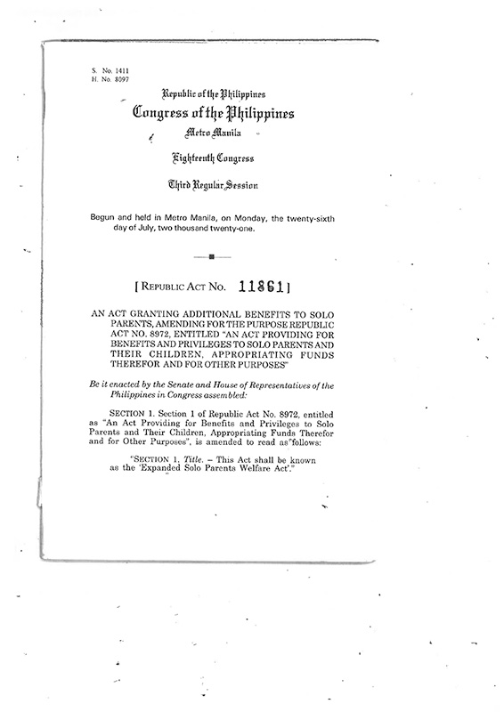 The Republic Act No. 11861, titled the Expanded Solo Parents Welfare Act, lapsed into law on June 4 without the signature of President Rodrigo Duterte.