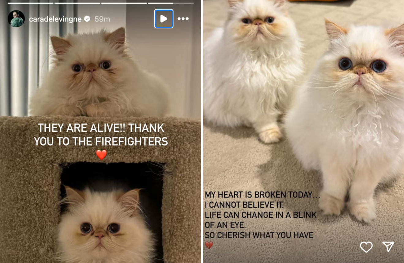 "My heart is broken today... I cannot believe it. Life can change in a blink of an eye. So cherish what you have," she wrote, sharing some pictures of her two cats, which she said are doing fine after the fire.