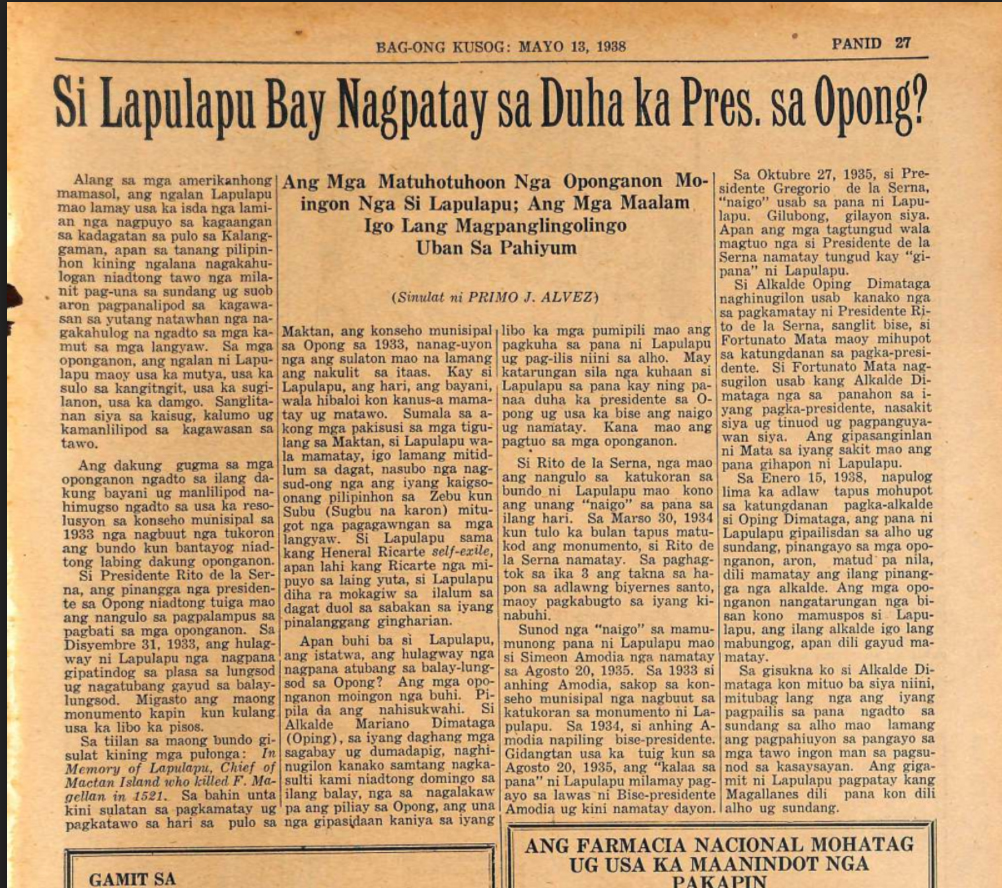 The title of the story was, “Si Lapulapu Bay Nagpatay sa Duha ka Pres. sa Opong?” which translates to “Did Lapulapu kill the two Presidents of Opong?”