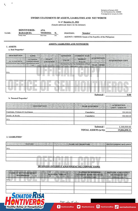 Sen. Risa Hontiveros has made her 2024 Statement of Assets, Liabilities, and Net Worth public.