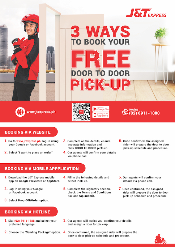 Customers can choose from three easy options to schedule their free pick up. They can visit the website at http://www.jtexpress.ph and log in via Google or Facebook, or download the J&T Express mobile app from the Google Playstore for Android users or the AppStore for iOS users. J&T representatives are also available to schedule pick ups through phone calls at (02)8911-1888. All transactions will be confirmed and coordinated by J&T before assigning a rider.