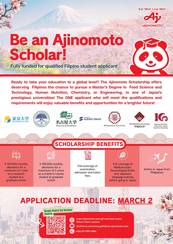 To know the full requirements and application process, visit: https://www.ajinomoto.com.ph/whats-new-archive/2027-ajinomoto-foundation-postgraduate-scholarship-grant/. The deadline for sending applications is March 2, 2026.