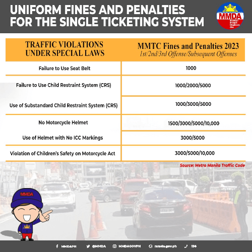 Aside from these, motorists can also be penalized for traffic violations under special laws, which include failure to use seat belt, not wearing motorcycle helmet, and more. Such can incur fines ranging from P1,000 to P10,000.