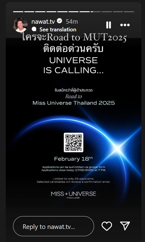 On his Instagram stories, Nawat also posted a series of posters calling for applications from aspiring queens who wanted to represent Thailand in the Miss Universe 2025 pageant.