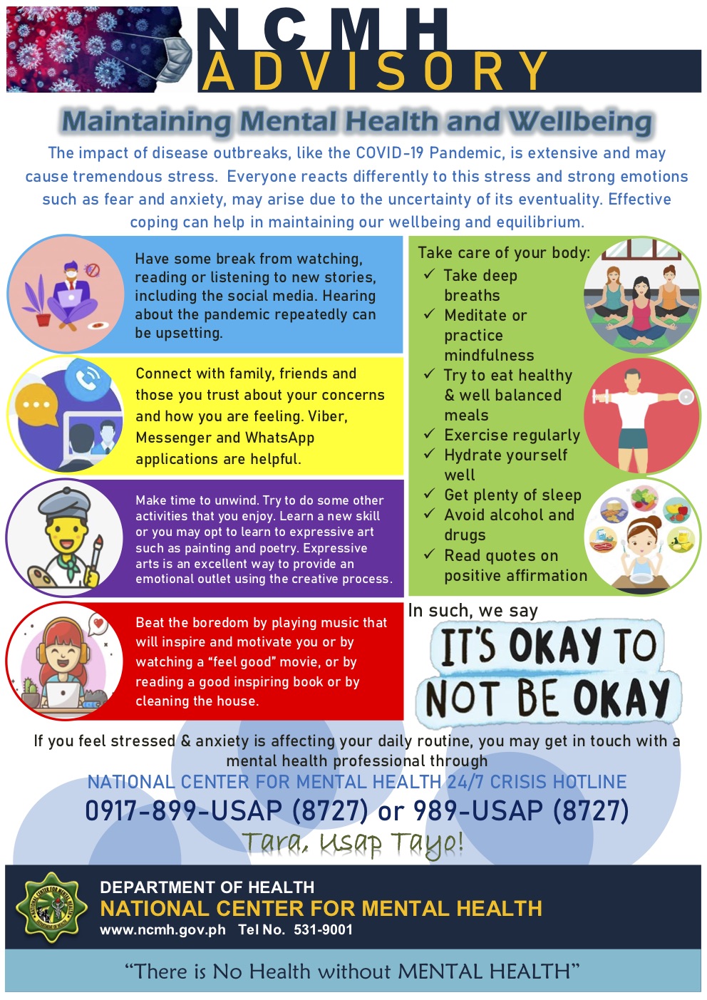 The NCMH crisis hotline is 0917-899-USAP (8727); (02) 7-989-USAP or 1553 (landline- toll-free).