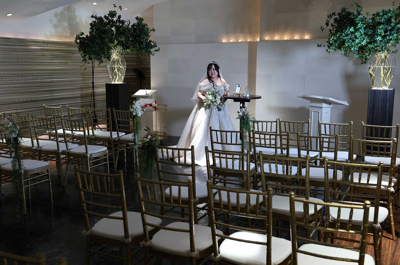 For the wedding picture shoot, a photographer, also wearing AR glasses, directed Noguchi to stand alone, in half the picture frame, so as to leave room for the image of the virtual groom.