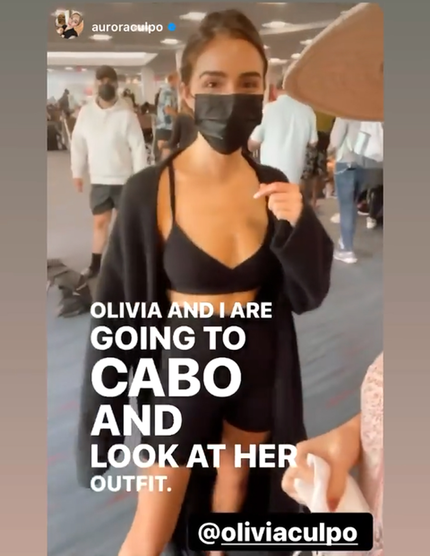 "Olivia and I are going to Cabo and look at her outfit," her sister Aurora said in her Instagram story, panning the camera to the former beauty queen, who was wearing a long black cardigan, sports bra, biker shorts, and a face mask.