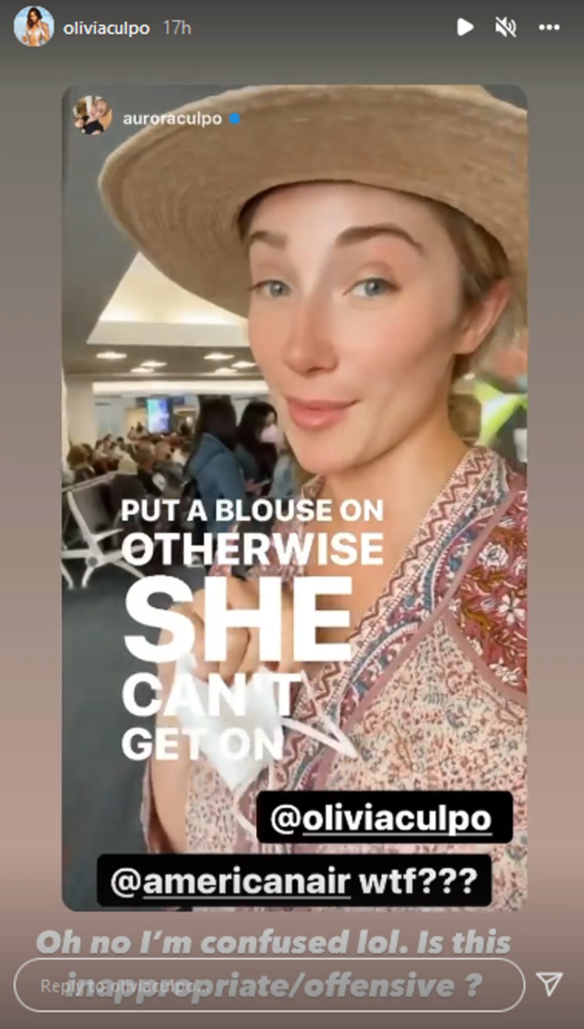 Aurora continued, "They call her up to the desk and tell her that she needs to put a blouse on, otherwise she can't get on the plane," which Olivia likewise shared her sister’s IG story to her own Instagram and wrote, "Tell me is that not so f----- up."