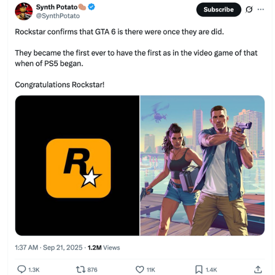 "Rockstar confirms that GTA 6 is there were once they are did. They became the first ever to have the first as in the video game of that when of PS5 began. Congratulations Rockstar!" it wrote.