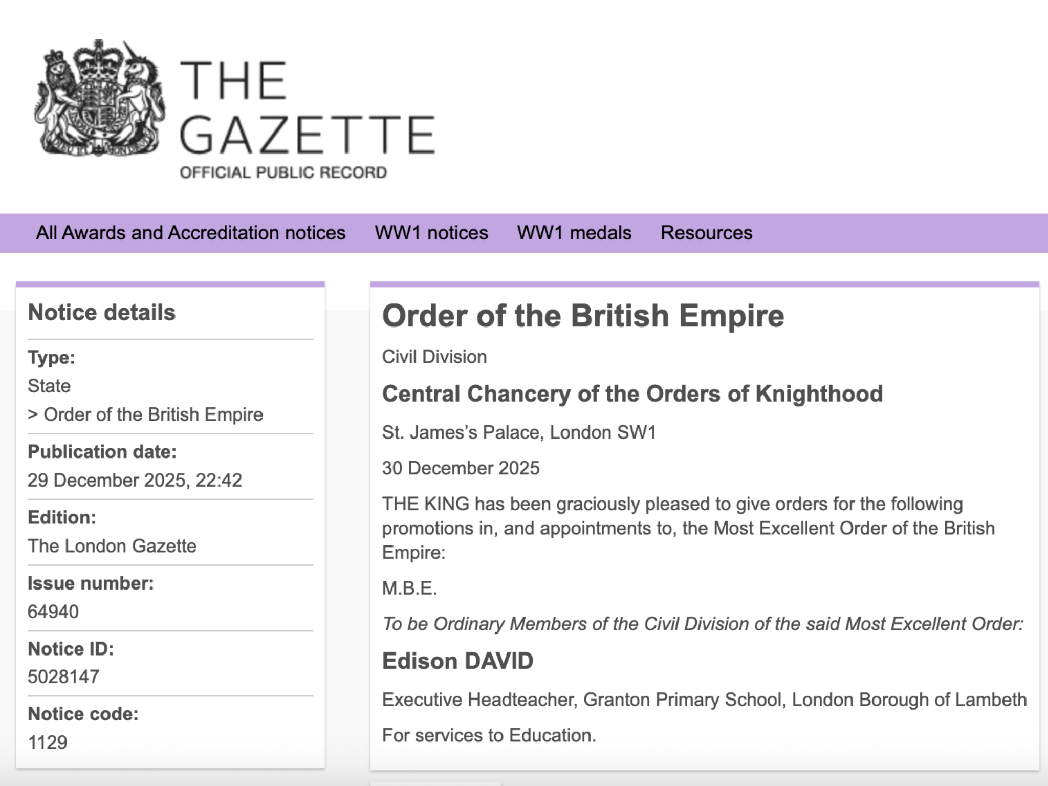 David, who works as an Executive Headteacher at Granton Primary School, has been awarded the Most Excellent Order of the British Empire, the third-highest ranking in the Order of the British Empire, following the CBE and OBE.