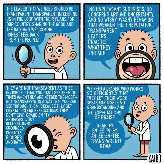 The leader that we need should be transparent. Transparent in keeping us in the loop with their plans for our country, sharing the good and bad, and welcoming honest feedback from the people.