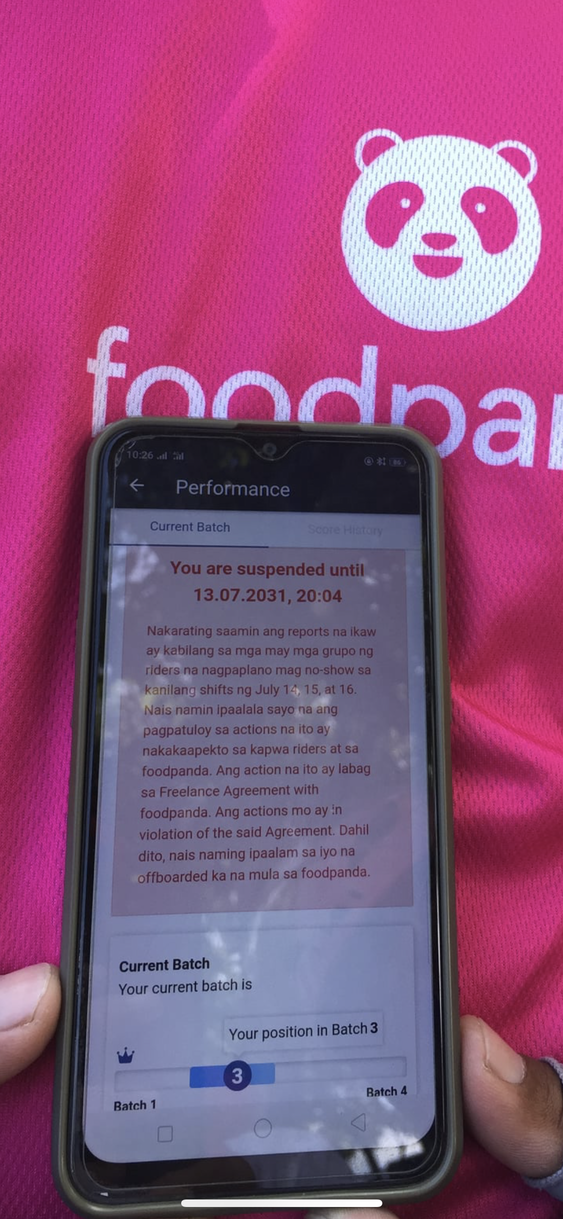 He was one of 31 Davao City riders recently slapped with a 10-year suspension by Foodpanda upon finding out about their plan to take a “rest day” as a silent protest to its wage policy.