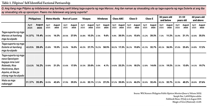 According to the noncommissioned August 2025 national survey of WR Numero, supporters of the Duterte family accounted for just 29% of respondents, an 11-point drop from April 2025.