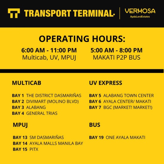 The Vermosa Transport Terminal, located along Daang Hari Road, will cater to several destinations such as The District Dasmariñas, SM Dasmariñas, Divimart Molino Boulevard, General Trias, Alabang, Alabang Town Center, Ayala Center Makati, Bonifacio Global City Market! Market!, One Ayala Makati, Ayala Malls Manila Bay, and Parañaque Integrated Terminal Exchange.
