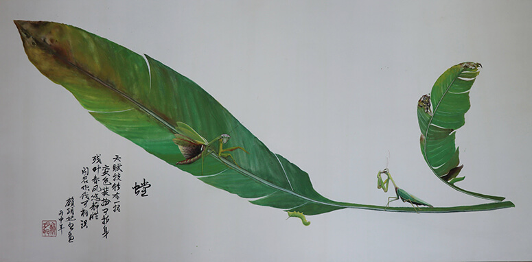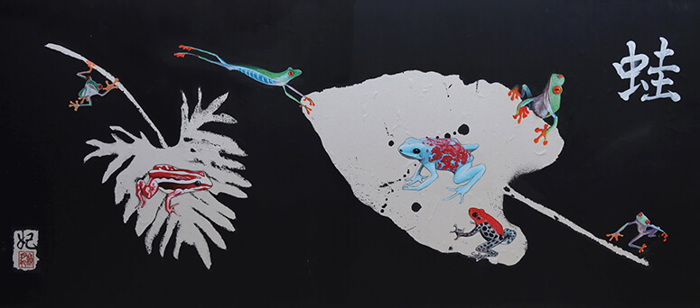 She infuses her art with an inimitable sense of humor. Like some frogs out on a date—did they end up croaking happily ever after? Or a praying mantis couple who did not pray and stay together.