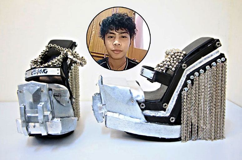 Paler’s shoe is predominantly made out of steel “to represent how strong she is as a woman” — thin, lightweight metal sheets lined with leather, and chains swinging at the “heel.” (The designer says the shoes are actually heelless.) “This artwork is the product of mother's love.”