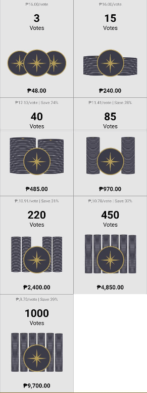 While the first vote is indeed free, you will need to break open your wallets if you want to cast in more votes. The prices range from P48 for 3 votes to P9,700 for 1,000 votes.