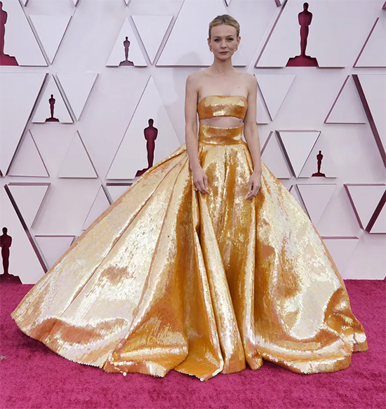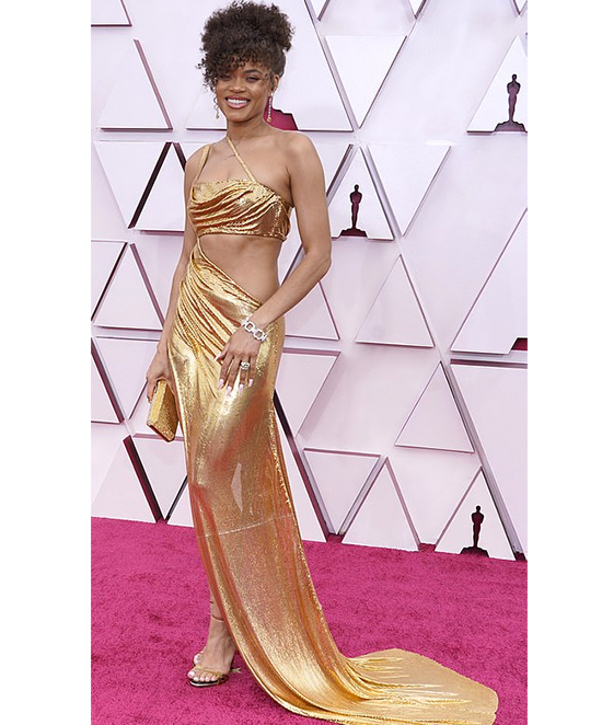 Carey Mulligan, best actress nominee for Promising Young Woman, was stellar in a gold-sequined skirt-bandeau set from Valentino, while fellow nominee Andra Day (for The United States vs. Billie Holiday), was slithering in metal mesh by Vera Wang. Both went bare midriff, a trend also essayed in the Valentino fluorescent yellow chiffon gown of presenter Zendaya, who piled it on with US$6 million worth of Bulgari gems. Her long, wavy hair was perfect for her draped, flowing gown, which gave her the look of a siren rising from the sea.