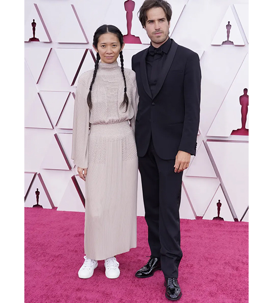 Chloe Zhao, director of best picture winner Nomadland, is the first Asian woman and only the second woman ever to win the best director award. To mark the historic moment, she dressed in her authentic, relaxed style: a nude knit dress and crisp, white sneakers from Hermès.