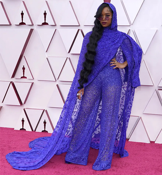 There were tributes to past Oscar night looks that gave an air of nostalgia: Filipino-American singer H.E.R., who won Best Original Song for Judas and the Black Messiah, wore a Peter Dundas cobalt blue jumpsuit with hooded cape that paid homage to Prince’s outfit in 1985.