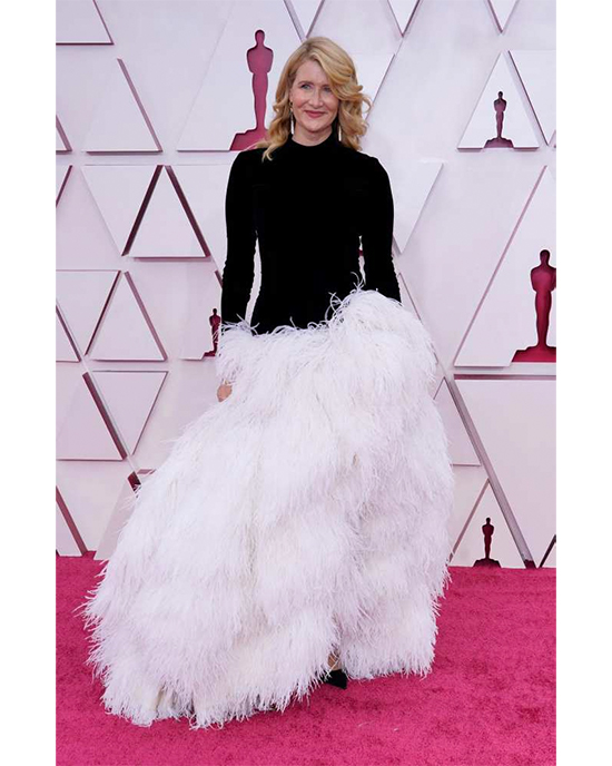 Laura Dern’s Oscar de la Renta dress with fitted black top and white ostrich feather skirt brought back memories of Bjork’s controversial swan dress worn in 2001.