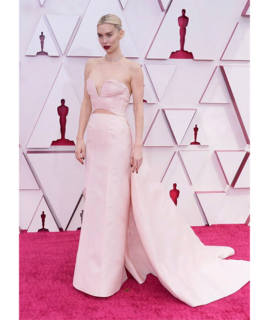 Red also had a strong following, with Amanda Seyfried, best supporting actress nominee for Mank, resplendent in a strapless tulle gown designed especially for her by Giorgio Armani himself. Inspired by the hibiscus flower, “it gives shape to passion, finely pleated, forming into a petal shape like an upside-down flower,” according to the designer, as told to Vogue. It channels the classic Hollywood glamour of the Jazz Age star Marion Davies, which she portrays in the film.