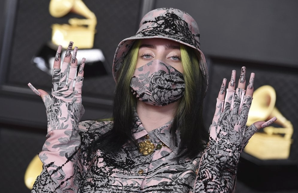 Prints also came into play, starting with Record of the Year winner Billie Eilish’s sepia rose floral jacquard shirt and pants, which she paired with a matching face mask, by Gucci.