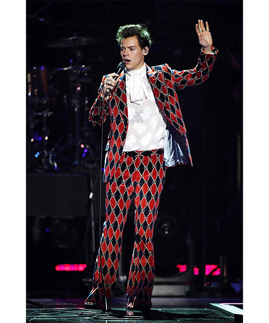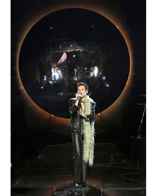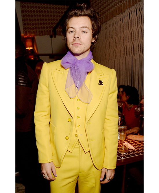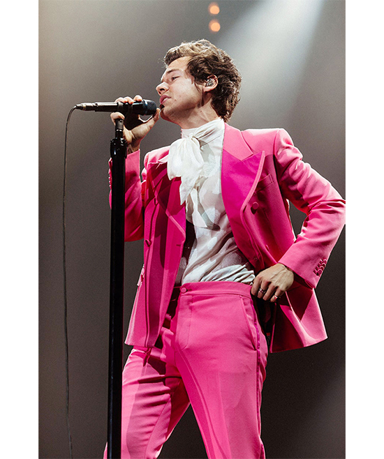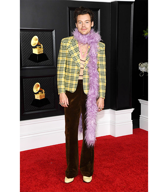 This idiosyncratic style was most evident at the recent Grammy Awards, where he performed Watermelon Sugar, the song that won him Best Pop Solo performance that evening. Wearing a glam-rock leather suit, he amped the sex factor further by going shirtless and pulled the unexpected with a lime-green boa, the ultimate symbol of camp individualism, favored by ’70s British music legends like David Bowie and Marc Bolan of T. Rex.