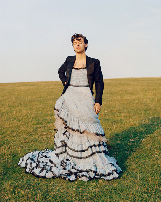 Harry is definitely today’s eccentric rock star par excellence, making him the perfect choice as the first man to appear solo on a Vogue cover in December 2020 — in an ice-blue lace Gucci ballgown at that! He was out to make ruffles a compelling fashion option for men the way Mick Jagger did for Mr. Fish’s white cotton “man dress” in a Hyde Park concert in 1969.