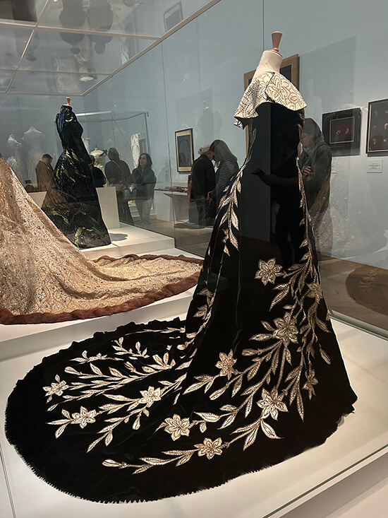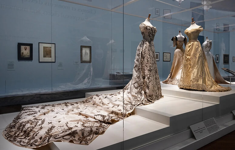 Although most of Worth’s order books have disappeared, records exist from the early days of Louis Vuitton who made the trunks to transport his couture; and Cartier, who created jewelry to match—both featured in the exhibit which showcases some of the most sumptuous dresses like that of Countess Élizabeth Greffulhe, the inspiration for Proust’s Duchess of Guermantes of À la Recherche du Temps Perdu. Worth himself is immortalized in Émile Zola’s La Curée as the fictional Worm, “the genius tailor, before whom the Second Empire’s rulers took to their knees.”