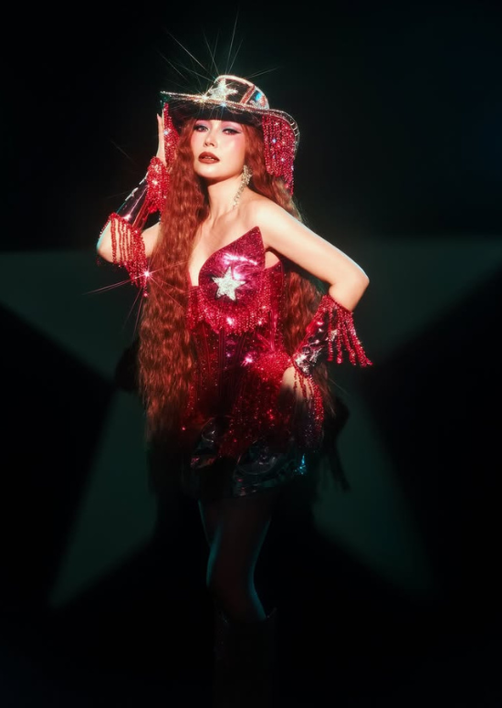 OPM singer Yeng Constantino nailed her Chappell Roan look, wearing a structured, bedazzled body suit with fringe adornments on her arm accessories and a cowboy hat.