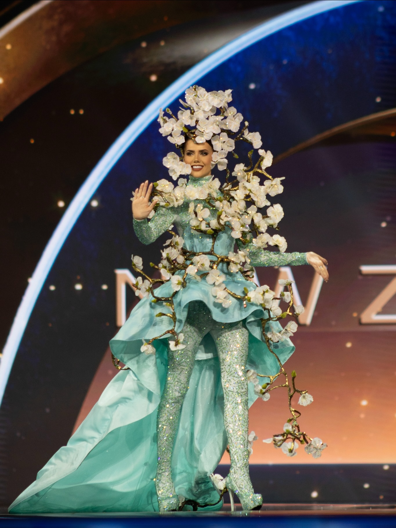 Nathalie Yasmin from the Netherlands shone in an outfit inspired by Vincent Van Gogh's "Almond Blossom" (1890). Her ensemble was styled like a living floral sculpture.