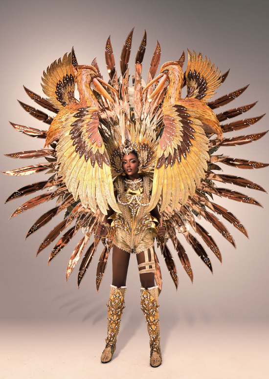 "Golden and earthy tones unfold around me like unfolding wings, each layer crafted to reflect the warm essence of home. Just as the pelican dives fearlessly and ascends with power, the people of Turks & Caicos face life with unity, hope, and unwavering determination," she wrote.