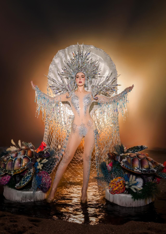Stephany Abasali of Venezuela also paid homage to her country's rich marine life. Looking like a marine deity, the beauty queen wore a nude bodysuit adorned with scale-like crystals. Her ethereal look was a standout with its sparkling fringe that cascades from the arms, which looked like a flowing ocean water, as well as the dramatic headdress that had coral-looking crystals, with a giant pear shell as a backdrop that enhances the piece.