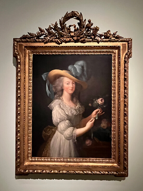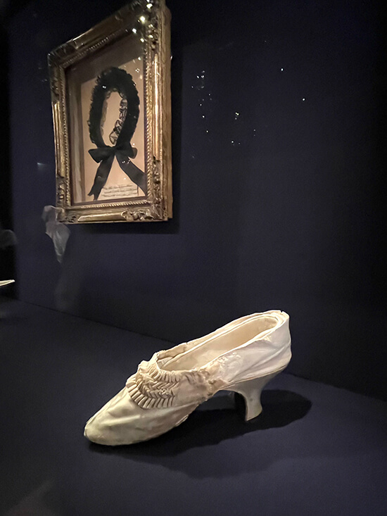 Only fragments of her gowns remain. A complete garment that was saved was her plain linen chemise, a rare survival from her incarceration at the Temple prison in 1793 before her death. After all the sumptuous gowns, dazzling jewelry, and exquisite objects in the previous rooms, this stark symbol of her diminished circumstances, showcased in a blood red room, shocks you into her tragic fate, which is made even more chilling by the display of the guillotine blade that ended her life.