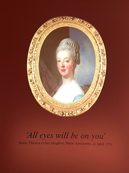 At the exhibit, we spotted a pair of teenage Chinese tourists who were dressed like the ill-fated French queen, walking reminders for their agricultural chief on trial for bribery (he has just been sentenced to death.) The duo couldn’t have been more perfect against the opening display: a portrait of Marie Antoinette at age 14 when she was betrothed to the future Louis XVI. Underneath her image is a quote from her mother, Maria Theresa, telling her daughter on that occasion: “All eyes will be on you.”