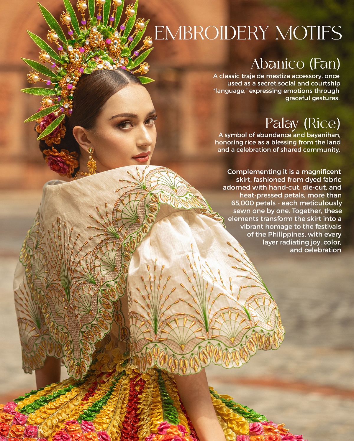 Manalo’s skirt—which was made from dyed fabric adorned with hand-cut, die-cut, and heat-pressed petals, more than 65,000 petals—is a tribute to three iconic Philippine festivals. Its three-tiered structure took inspiration from Pampanga's Giant Lantern Festival, featuring parol elements like the Tambur, Siku-Siku, and Palimbun. The vivid color scheme reflects the Pahiyas Festival of Lucban, while the texturized flourishes evoke the floral blooms of Baguio’s Panagbenga Festival.