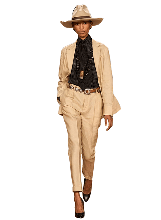 The biggest fashion splash was at Pharrell Williams’ sophomore outing for the Louis Vuitton FW2024 menswear show done in the style of a Western epic that paid tribute to Black cowboys by mixing traditional elements of cowboy hats, bolo ties, and large buckled belts with streetwear like hoodies and bomber jackets. To expand representation around cowboy imagery, which has historically leaned heavily on exclusively white references, he invited black and brown men from the Oklahoma Cowboys, a group that represents Black cowboy culture, to model the garments.