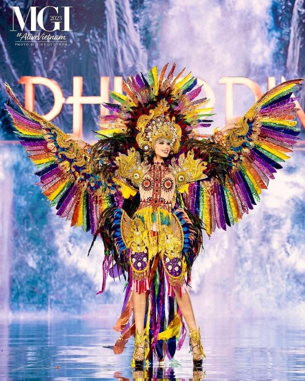 Designed by Er Stephen Alvarado, Nikki's ensemble is filled to the brim with intricate patterns, paying tribute to the rich cultural heritage and celebration of festivals in the Philippines. She capped off her look with a headdress made with colorful feathers and jewels that was meticulously designed to create a mesmerizing visual spectacle.