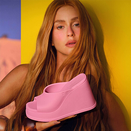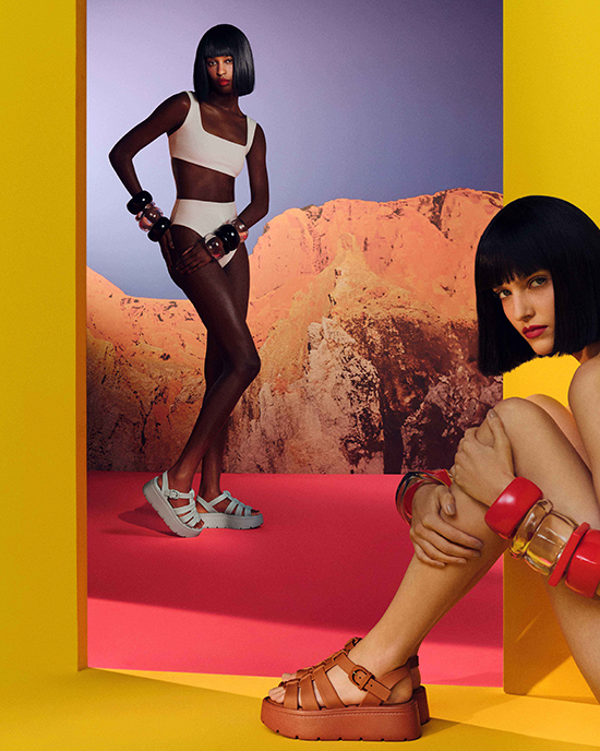Beloved styles return with fresh details and colorways. Melissa Anastasia now bridges business and everyday wear with its mule silhouette, square toe, and subtle buckle straps. The Melissa Free Fuzzy Platform, crafted from injected EVA monoblock, adds a feminine bow accent, while Melissa Beta evolves from a classic ballerina into lace-up flats that hug the ankles, now available in metallic silver and other festive hues.