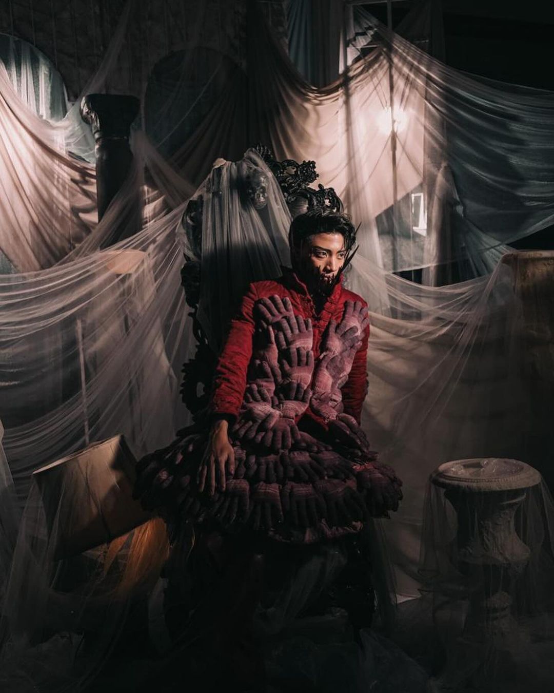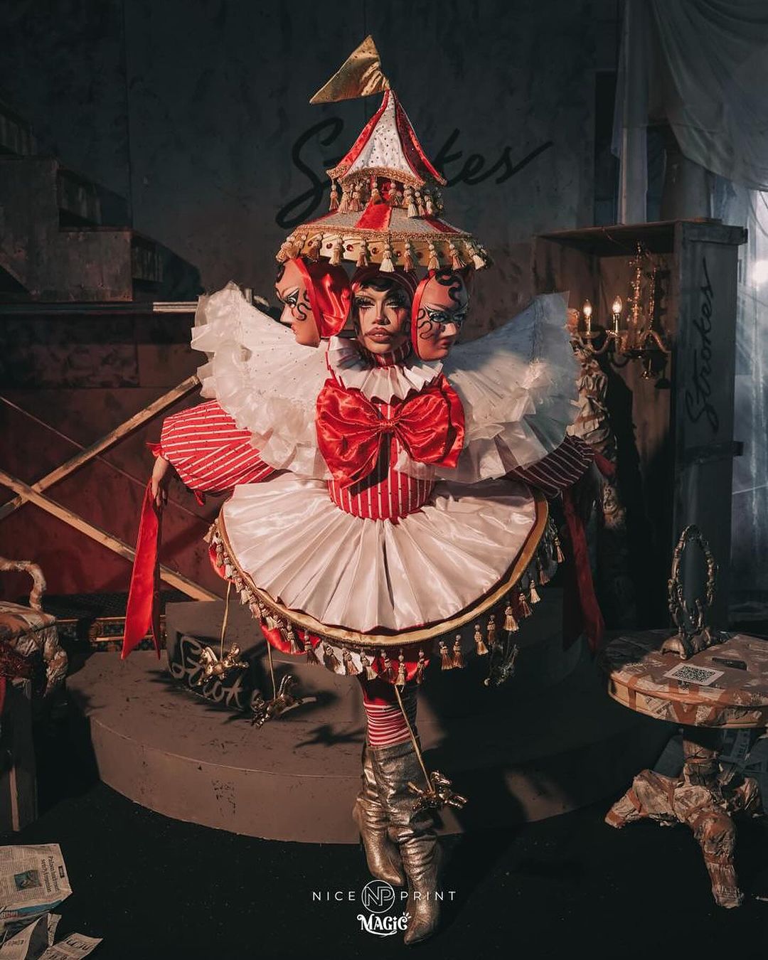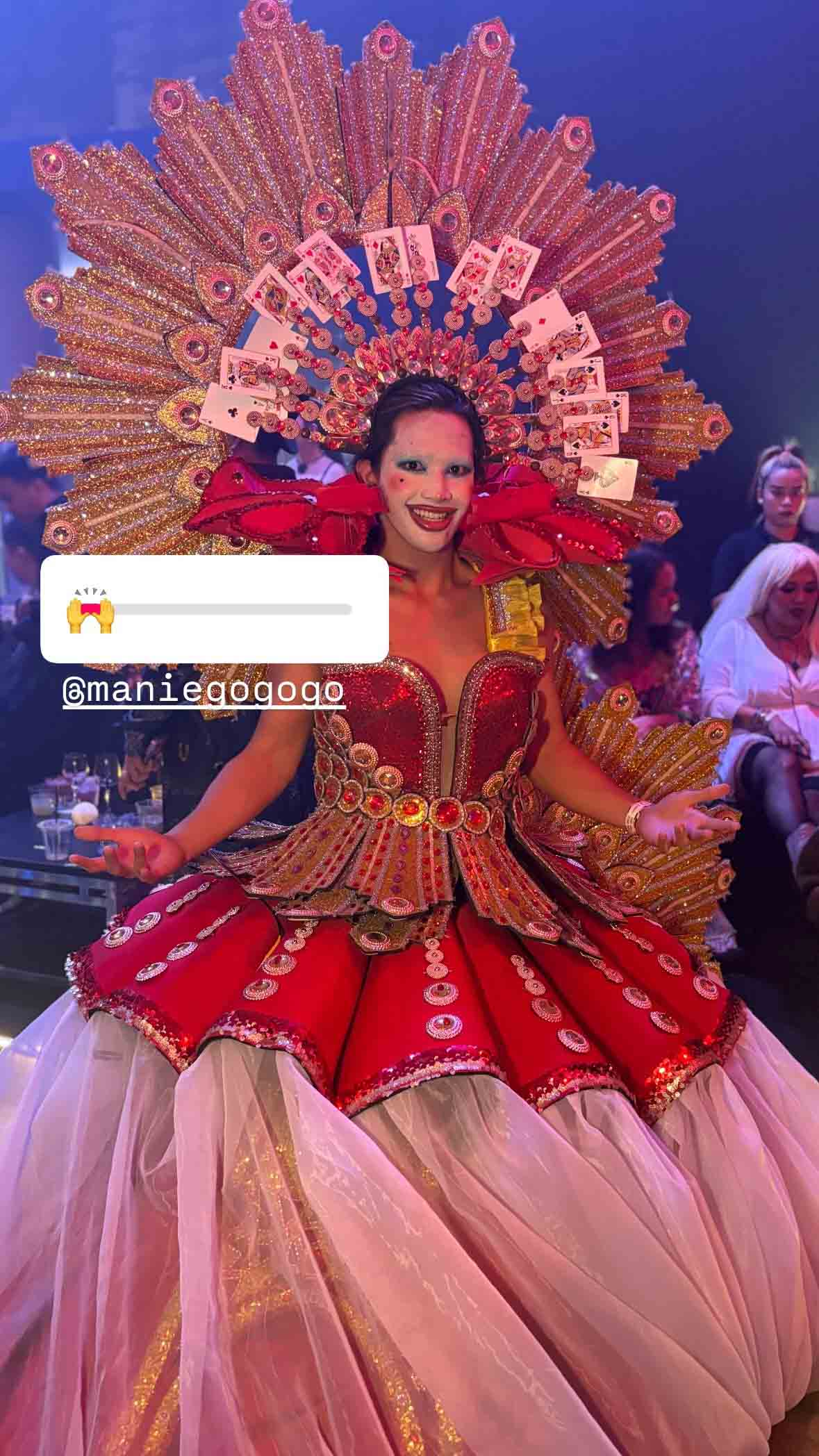 Content creator Aaron Maniego's circus-inspired costume was a dazzling spectacle, featuring a ball gown and a headdress adorned with a cascade of playing cards.