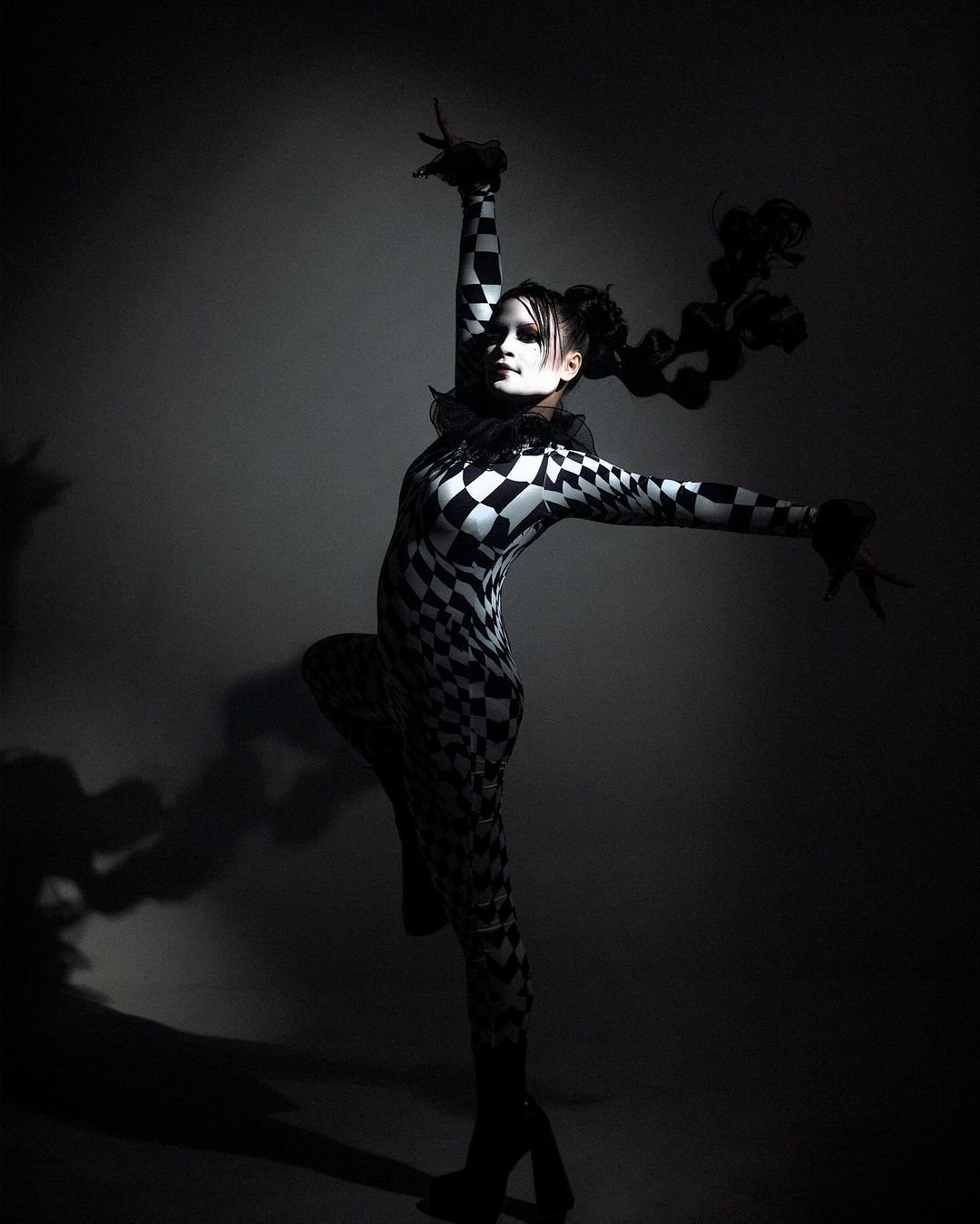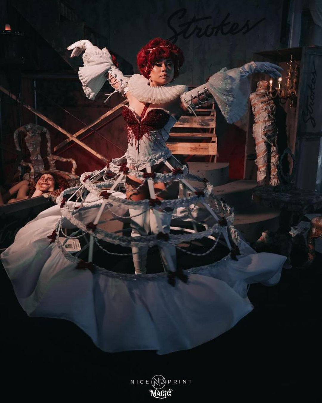 Rope artist Joyen Santos' white and red costume was a captivating spectacle, combining a classic circus clown attire with the seductive elements of burlesque.